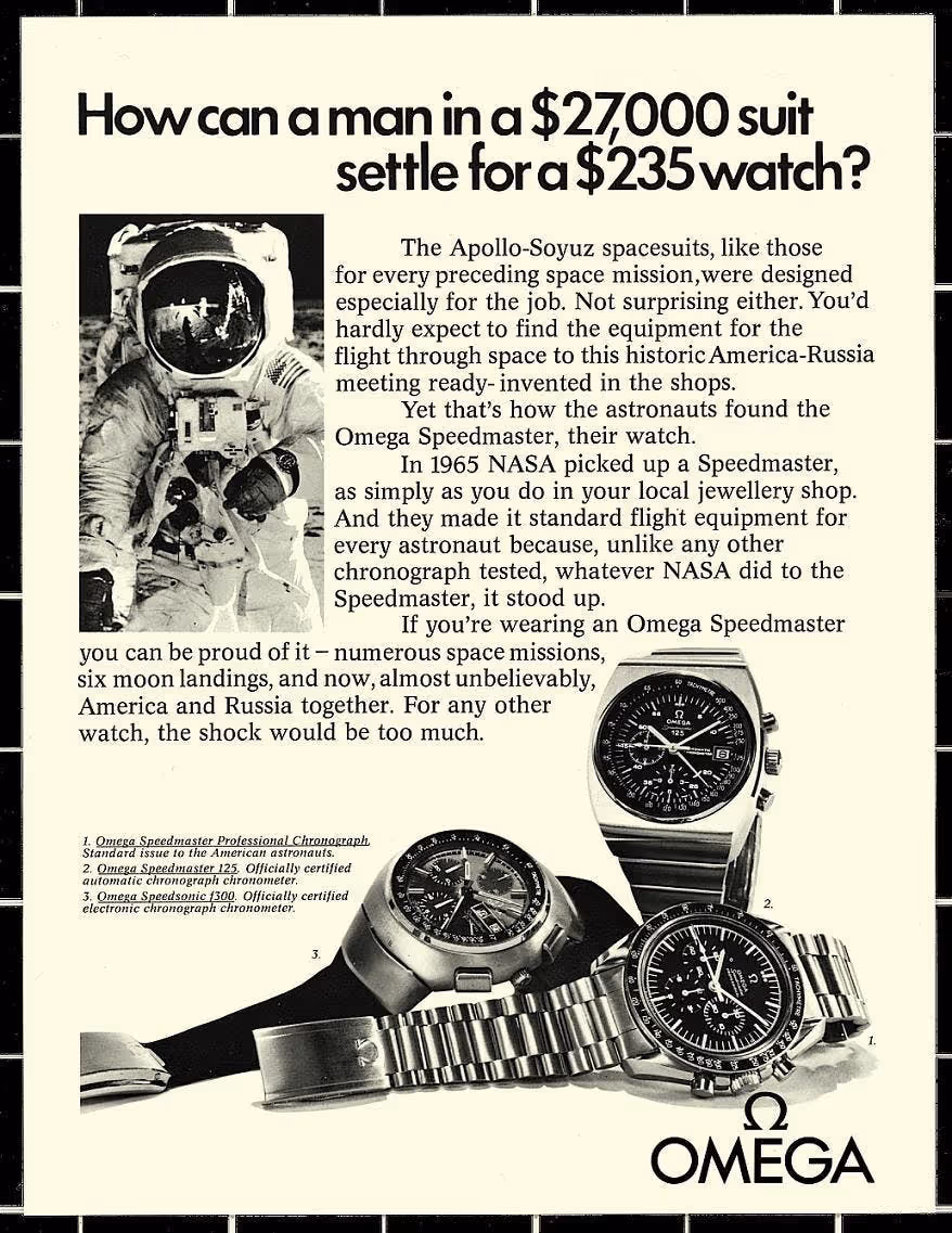 A $235 watch is framed as more valuable because it's worn by an Astronaut in a $27,000 suit.